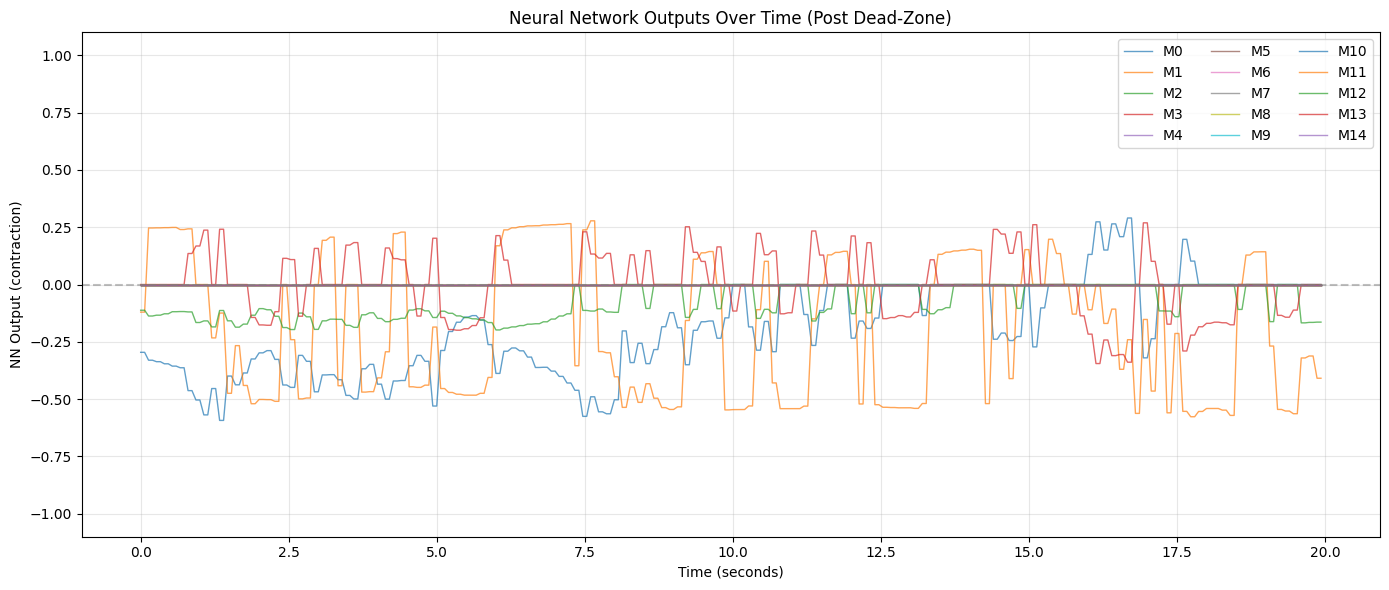 Now there is no base oscillation anymore. The network has full control over when and how each muscle contracts.