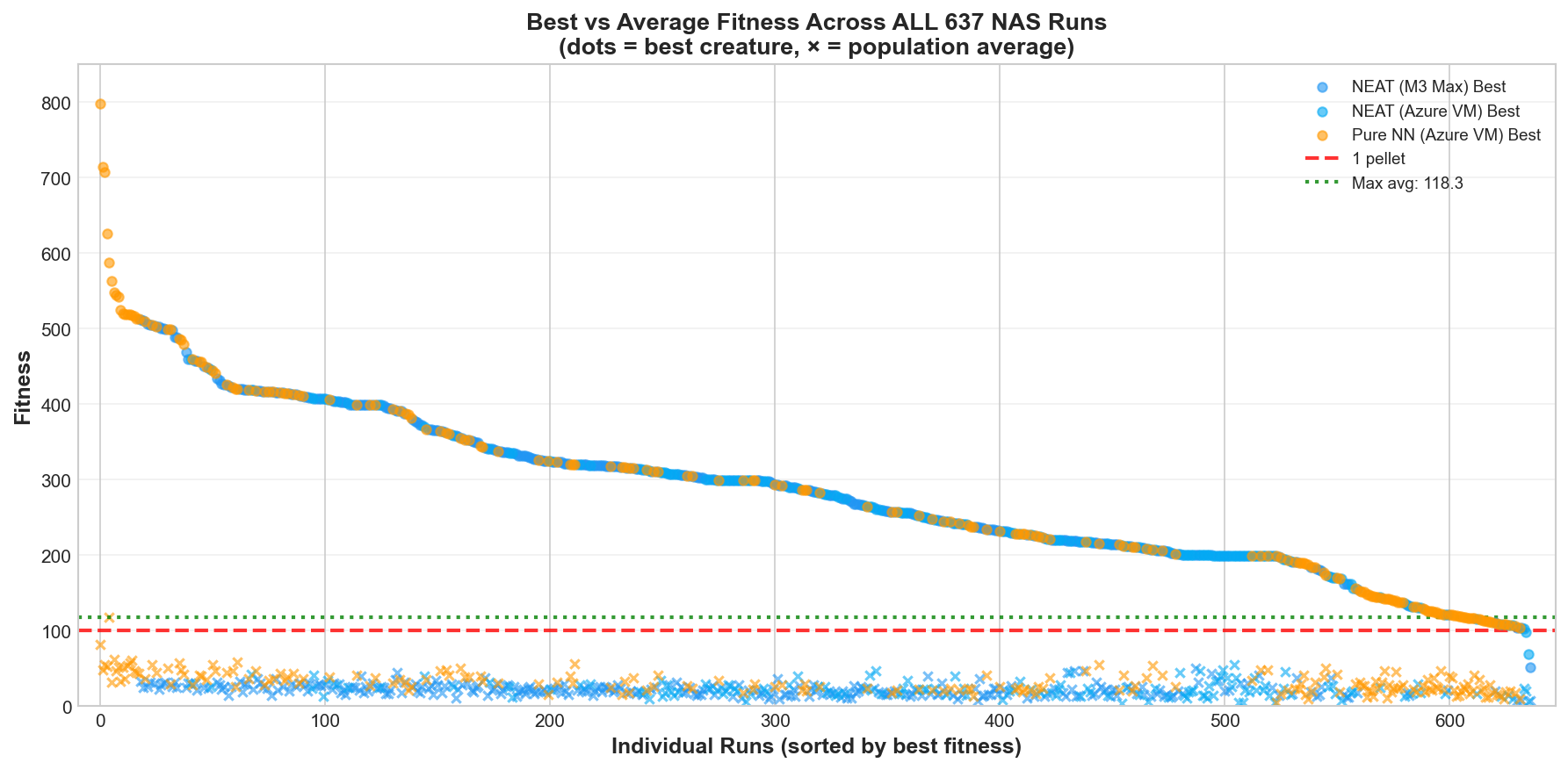 The winners were outliers, not the norm. Best fitness varies wildly with luck, but average fitness never exceeded 100 (one pellet) across all 100 NAS trials.