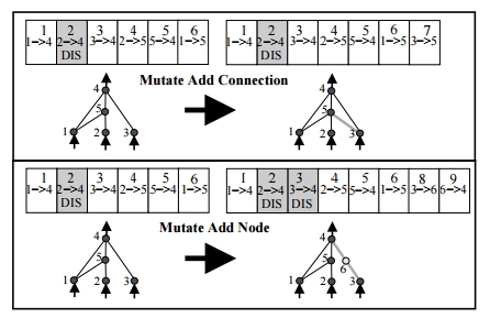 From these mutations, networks can start with 0 connections and hidden nodes and grow to be as complex as needed.