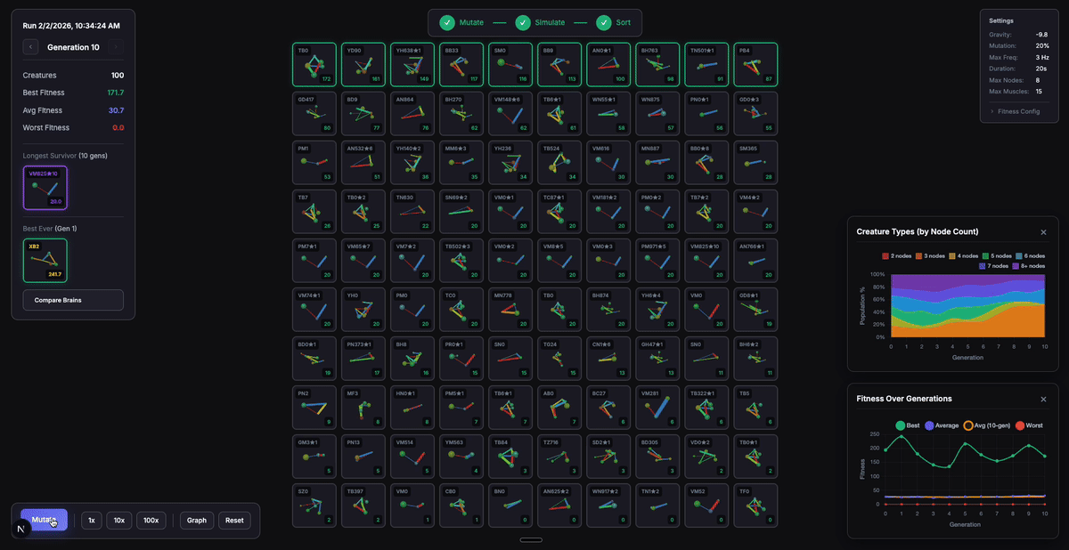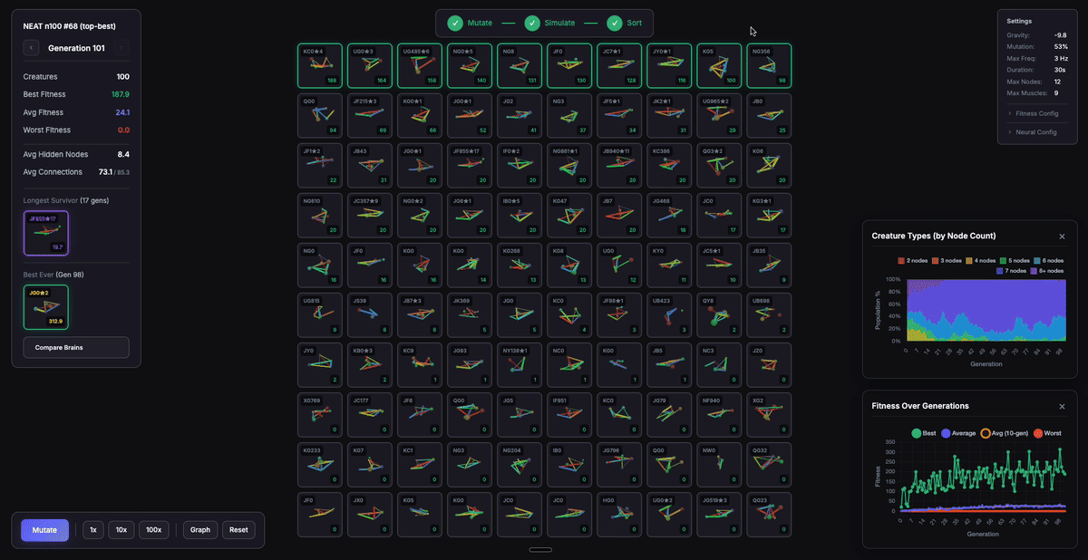 I have more experiments I want to try: energy systems (metabolic cost for muscle activation), multi-layer hidden networks, better NEAT crossover alignment by matching muscle innovation IDs, recurrent connections (memory), HyperNEAT (indirect encoding via CPPNs), novelty search, coevolution, interspecies mating, actually figuring out why crossover hurts, and gaining more statistical significance on the best runs.
