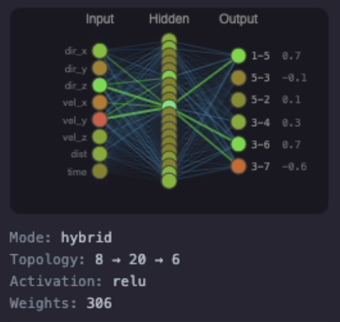 Each creature gets a small feedforward network: sensory inputs → hidden layer → muscle outputs. The network outputs one value per muscle in , which directly controls muscle length: . Output of +1 means fully contracted, -1 means fully extended.