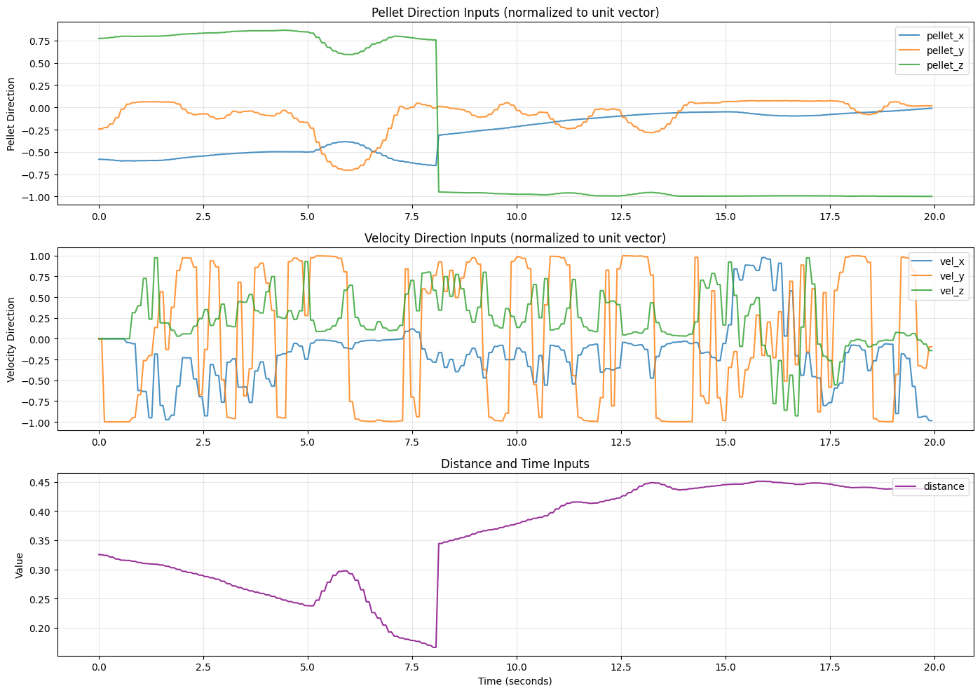 | Pellet direction | 3 | Where is the food? (unit vector, x, y, z) |