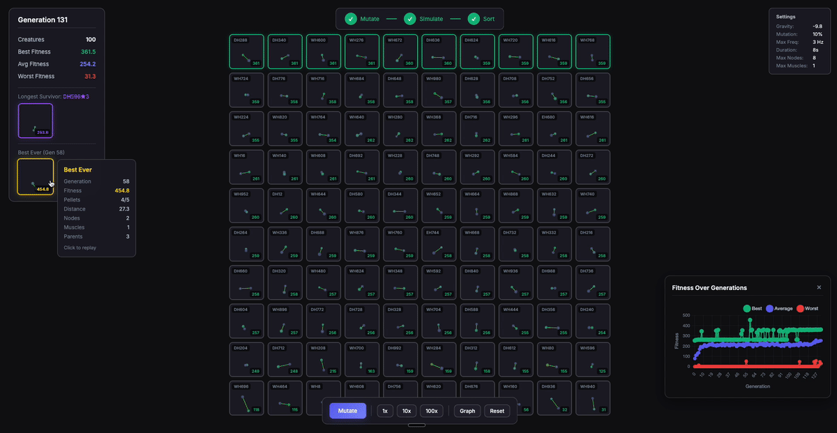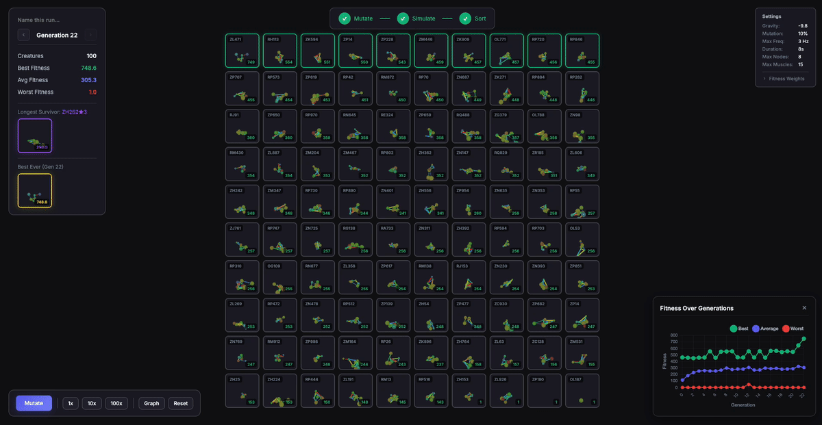 I spent two weeks building an evolution simulator where my creatures learned to "walk" toward food. I ran millions of generations across 597 genetic lineages to create the optimal species. This is a journal of that process: implementing the papers, fixing bugs, counterintuitive walls I ran into, and working with Claude Code.