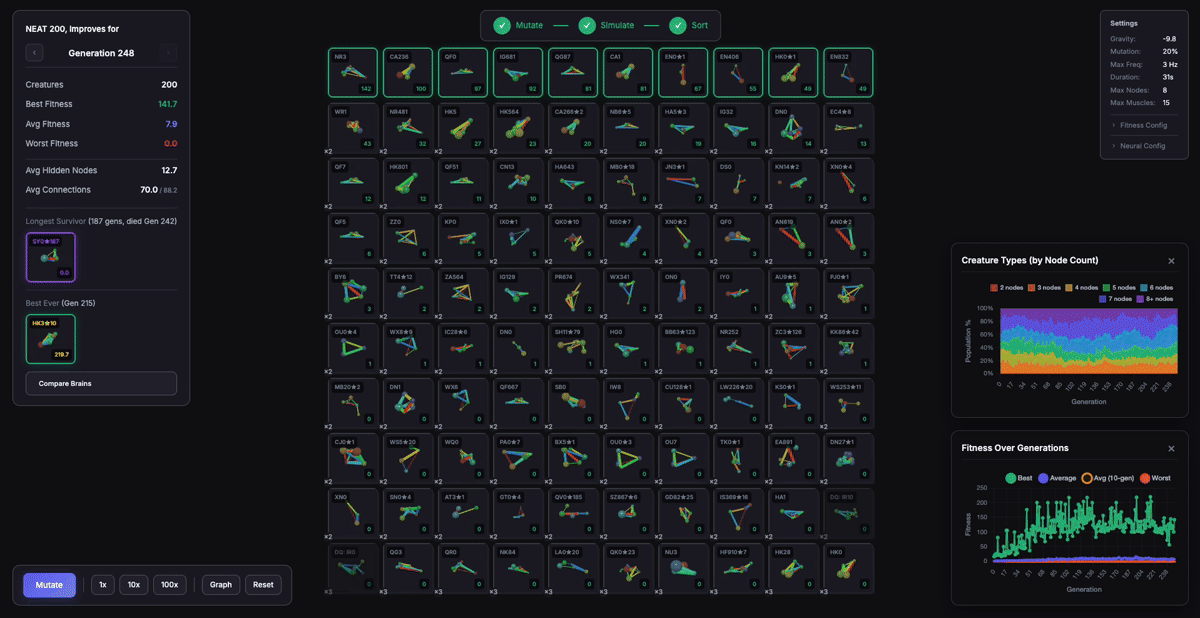 Claude Code is great at writing code. It's not great at telling you when you're implementing an algorithm wrong. The NEAT bugs (wrong mutation rates, wrong crossover alignment, etc) all came from not reading the paper carefully enough.