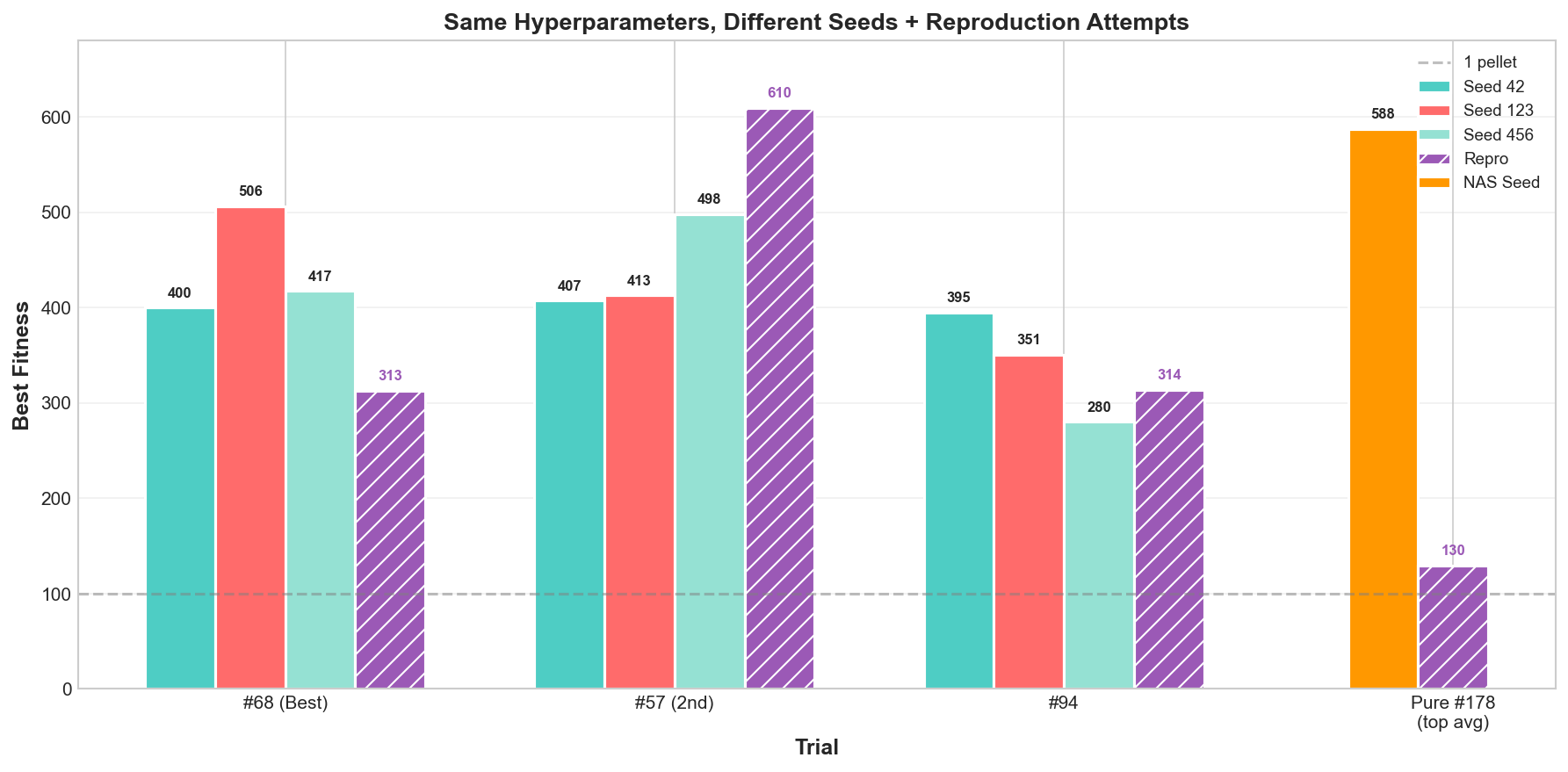 NEAT #57 actually exceeded its NAS result (609.5 vs 439), a lucky seed. But Pure #42 and NEAT #68 fell far short. Pure #178's reproduction was especially disappointing - from 118.3 average down to 24.2. Across all 13 reproduction runs, the best performers were: