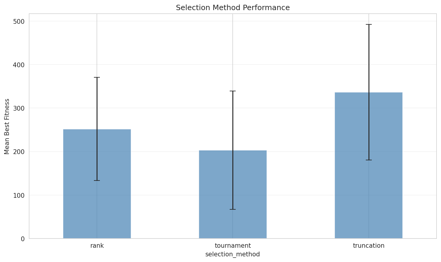 | Rank | Selection probability proportional to rank, not raw fitness | Gentler pressure. Creature at rank 2 isn't 10x more likely to survive than rank 10. |